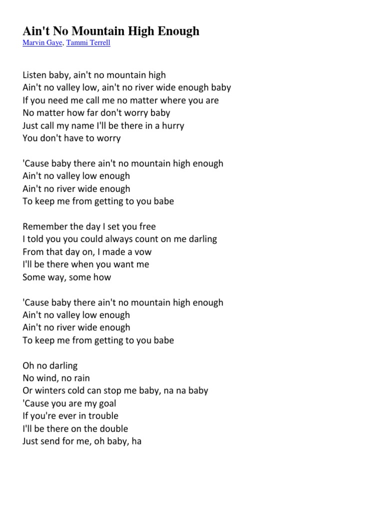 Download Aint No Mountain High Enough song and listen Aint No Mountain High Enough MP3 song offline. Cause baby there aint no mountain high enough. Aint no valley low enough. If you need me call me No matter where you are No matter how far Dont worry baby Just call my name Ill be there in a hurry You dont have to worry. Just call my name Ill be there in a hurry. Listen baby Aint no mountain high Aint no valley low Aint no river wide enough baby If you need me call me No matter where you are No matter how. I set you free.